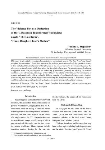 Библиографическое описание:Stepanova, Vasilina. The Violence Plot as a Reflection of the V. Rasputin Transformed Worldview: novels "The Last term", "Ivan`s Daughter, Ivan`s Mother" = Сюжет насилия как отражение трансформации мировоззрения В. Распутина: повести "Последний срок", "Дочь Ивана, мать Ивана" / V. A. Stepanova. - Текст : непосредственный // Журнал Сибирского федерального университета. Гуманитарные науки. - 2016. - Т. 9, № 5. - С. 1148-1154. - Библиогр.: с. 1154. - ISSN 1997-1370.