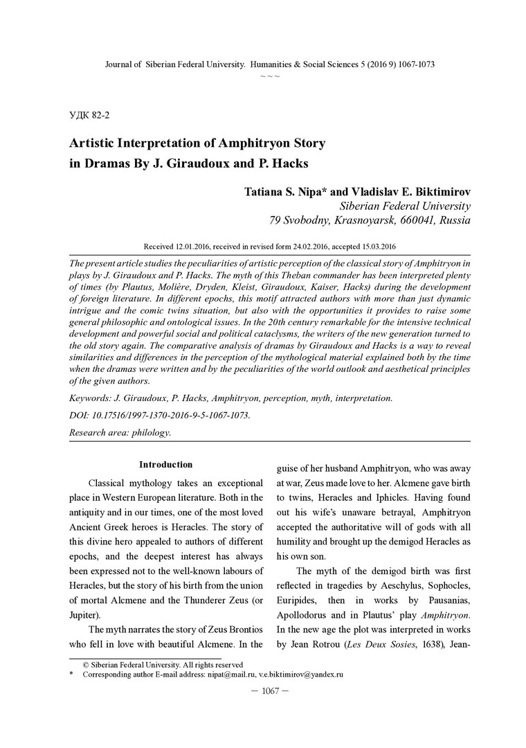 Библиографическое описание:Nipa, Tatiana. Artistic Interpretation of Amphitryon Story in Dramas By J. Giraudoux and P. Hacks = Художественная интерпретация сюжета об Амфитрионе в драмах Ж. Жироду и П. Хакса / T. S. Nipa, V. E. Biktimirov. - Текст : непосредственный // Журнал Сибирского федерального университета. Гуманитарные науки. - 2016. - Т. 9, № 5. - С. 1067-1073. - Библиогр.: с. 1072-1073. - ISSN 1997-1370.