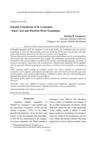 Библиографическое описание: Urazayeva, Kuralay. Kazakh Translations of M. Lermontov: "Alien" Text and Word-for-Word Translation = Казахские переводы М. Лермонтова: "Чужой" текст и буквальный перевод / K. B. Urazayeva. - Текст : непосредственный // Журнал Сибирского федерального университета. Гуманитарные науки. - 2016. - Т. 9, № 5. - С. 1210-1220. - Библиогр.: с. 1219-1220. - ISSN 1997-1370.