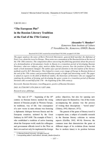 Библиографическое описание: Shunkov, Alexander. "The European Plot" in the Russian Literary Tradition at the End of the 17th Century = "Европейский сюжет" в русской книжной традиции конца XVII века / A. V. Shunkov. - Текст : непосредственный // Журнал Сибирского федерального университета. Гуманитарные науки. - 2016. - Т. 9, № 5. - С. 1057-1066. - Библиогр.: с. 1064-1066. - ISSN 1997-1370.