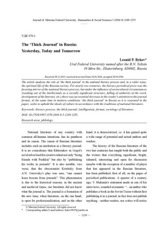 Библиографическое описание: Bykov, Leonid. The "Thick Journal" in Russia: Yesterday, Today and Tomorrow = "Толстый журнал" в России: вчера, сегодня, завтра / L. P. Bykov. - Текст : непосредственный // Журнал Сибирского федерального университета. Гуманитарные науки. - 2016. - Т. 9, № 5. - С. 1249-1255. - Библиогр.: с. 1255. - ISSN 1997-1370.