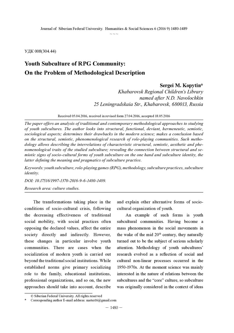 Библиографическое описание: Kopytin, Sergei. Youth Subculture of RPG Community: On the Problem of Methodological Description = Молодежная субкультура сообщества ролевых игр: проблема методологического определения / S. M. Kopytin. - Текст : непосредственный // Журнал Сибирского федерального университета. Гуманитарные науки. - 2016. - Т. 9, № 6. - С. 1480-1489. - Библиогр.: с. 1487-1489. - ISSN 1997-1370.