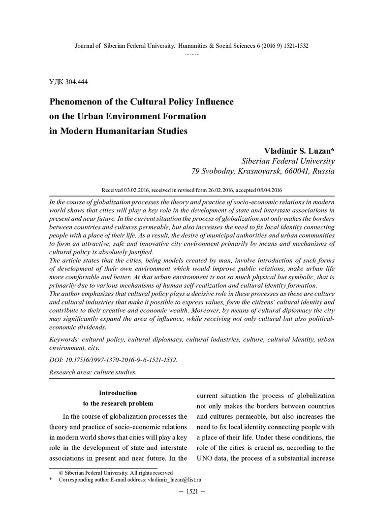 Библиографическое описание:Luzan, Vladimir. Phenomenon of the Cultural Policy Influence on the Urban Environment Formation in Modern Humanitarian Studies = Феномен влияния культурной политики на формирование городской среды в современных гуманитарных исследованиях / V. S. Luzan. - Текст : непосредственный // Журнал Сибирского федерального университета. Гуманитарные науки. - 2016. - Т. 9, № 6. - С. 1521-1532. - Библиогр.: с. 1528-1532. - ISSN 1997-1370.