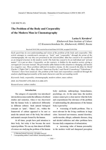 Библиографическое описание: Kovaleva, Larisa. The Problem of the Body and Corporality of the Modern Man in Cinematography = Проблема тела и телесности современного человека в кинематографе / L. S. Kovaleva. - Текст : непосредственный // Журнал Сибирского федерального университета. Гуманитарные науки. - 2016. - Т. 9, № 6. - С. 1466-1473. - Библиогр.: с. 1472-1473. - ISSN 1997-1370.