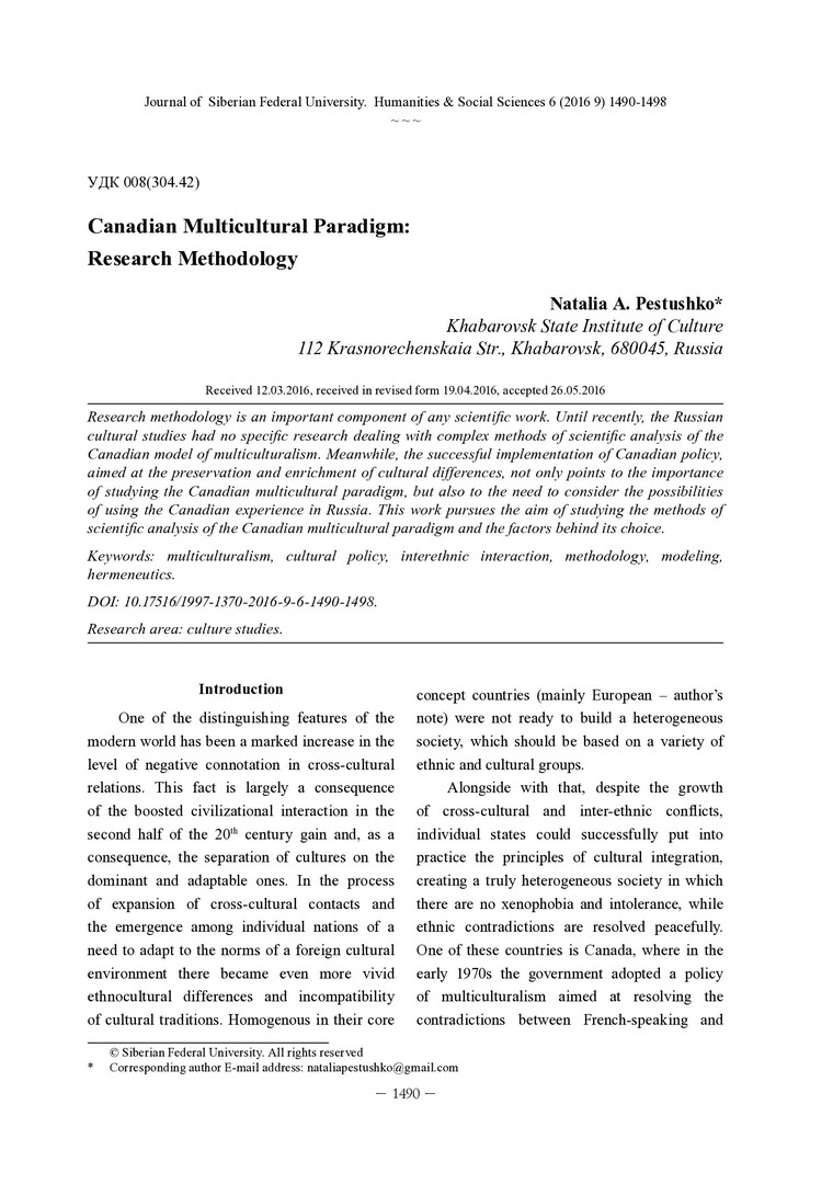Библиографическое описание:Pestushko, Natalia. Canadian Multicultural Paradigm: Research Methodology = Канадская мультикультурная парадигма: методология исследования / N. A. Pestushko. - Текст : непосредственный // Журнал Сибирского федерального университета. Гуманитарные науки. - 2016. - Т. 9, № 6. - С. 1490-1498. - Библиогр.: с. 1496-1498. - ISSN 1997-1370.