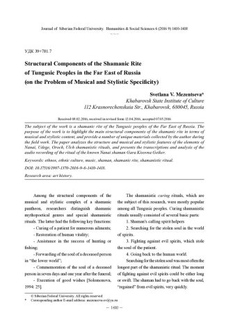 Библиографическое описание:Mezentseva, Svetlana. Structural Components of the Shamanic Rite of Tungusic Peoples in the Far East of Russia (on the Problem of Musical and Stylistic Specificity) = Структурные компоненты шаманского обряда тунгусо-маньчжурских народов Дальнего Востока России (К проблеме музыкально-стилевой специфики) / S. V. Mezentseva. - Текст : непосредственный // Журнал Сибирского федерального университета. Гуманитарные науки. - 2016. - Т. 9, № 6. - С. 1410-1418. - Библиогр.: с. 1417-1418. - ISSN 1997-1370.
