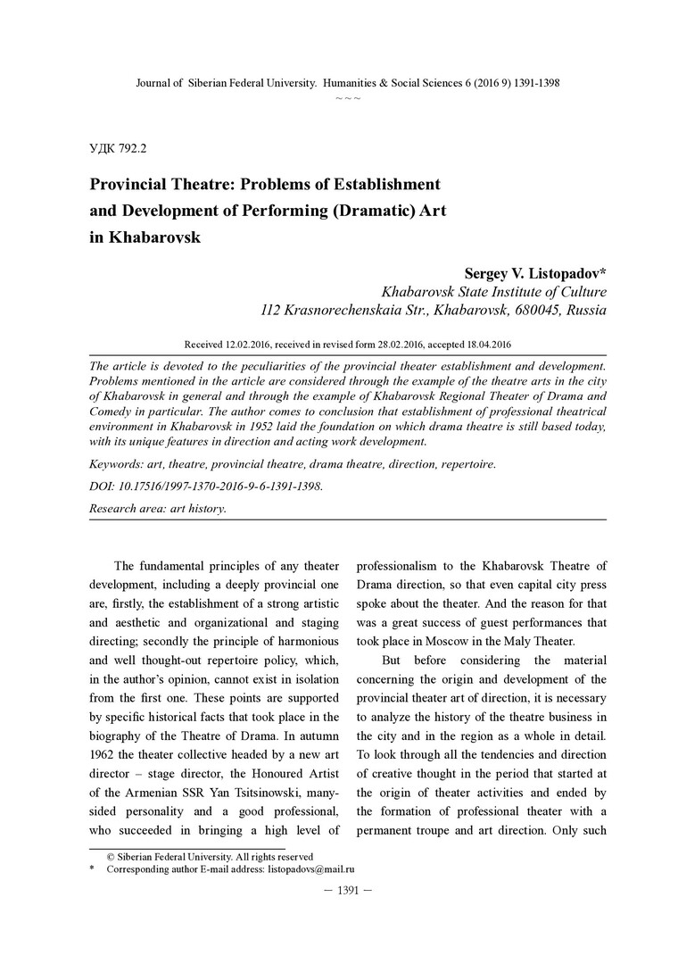 Библиографическое описание:Listopadov, Sergey. Provincial Theatre: Problems of Establishment and Development of Performing (Dramatic) Art in Khabarovsk = Провинциальный театр: проблемы становления и развития театрального искусства в Хабаровске / S. V. Listopadov. - Текст : непосредственный // Журнал Сибирского федерального университета. Гуманитарные науки. - 2016. - Т. 9, № 6. - С. 1391-1398. - Библиогр.: с. 1397-1398. - ISSN 1997-1370.