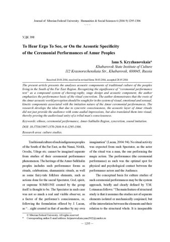 Библиографическое описание:Kryzhanovskaia, Iana. To Hear Ergo To See, or On the Acoustic Specificity of the Ceremonial Performances of Amur Peoples = Слышать ergo, видеть, или Об акустической специфике обрядового зрелища амурских этносов / Ia. S. Kryzhanovskaia. - Текст : непосредственный // Журнал Сибирского федерального университета. Гуманитарные науки. - 2016. - Т. 9, № 6. - С. 1295-1306. - ISSN 1997-1370.