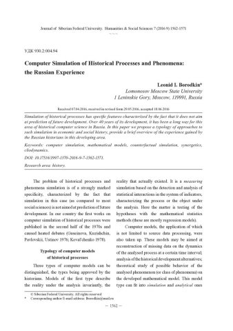 Computer Simulation of Historical Processes and Phenomena: the Russian Experienceстатья из журнала