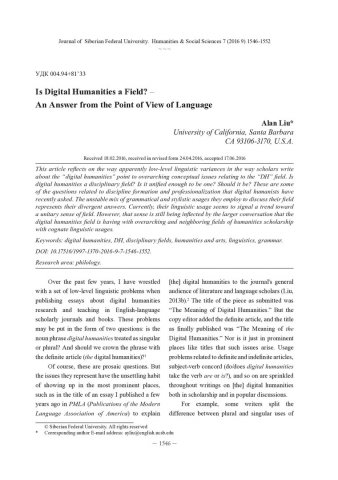 Библиографическое описание: Alan Liu. Is Digital Humanities a Field? An Answer from the Point of View of Language = Цифровые гуманитарные науки: новая отрасль? Лингвистическая точка зрения / Alan Liu. - Текст : непосредственный // Журнал Сибирского федерального университета. Гуманитарные науки. - 2016. - Т. 9, № 7. - С. 1546-1552. - Библиогр.: с. 1551-1552. - ISSN 1997-1370.