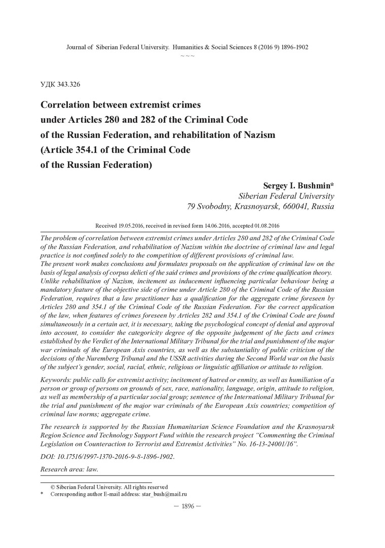 Библиографическое описание:Bushmin, Sergey. Correlation between extremist crimes under Articles 280 and 282 of the Criminal Code of the Russian Federation, and rehabilitation of Nazism (Article 354.1 of the Criminal Code of the Russian Federation) = Соотношение преступлений экстремистской направленности, предусмотренных ст.ст. 280 и 282 УК РФ, и реабилитации нацизма (ст. 354.1 УК РФ) / S. I. Bushmin. - Текст : непосредственный // Журнал Сибирского федерального университета. Гуманитарные науки. - 2016. - Т. 9, № 8. - С. 1896-1902. - Библиогр.: с. 1900-1902. - ISSN 1997-1370.