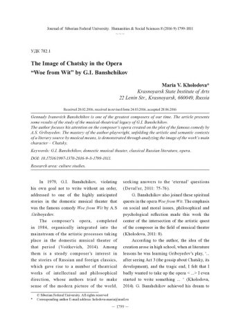 Библиографическое описание:Kholodova, Maria. The Image of Chatsky in the Opera "Woe from Wit" by G.I. Banshchikov = Образ Чацкого в опере "Горе от ума" Г. И. Банщикова / M. V. Kholodova. - Текст : непосредственный // Журнал Сибирского федерального университета. Гуманитарные науки. - 2016. - Т. 9, № 8. - С. 1799-1811. - Библиогр.: с. 1811. - ISSN 1997-1370.
