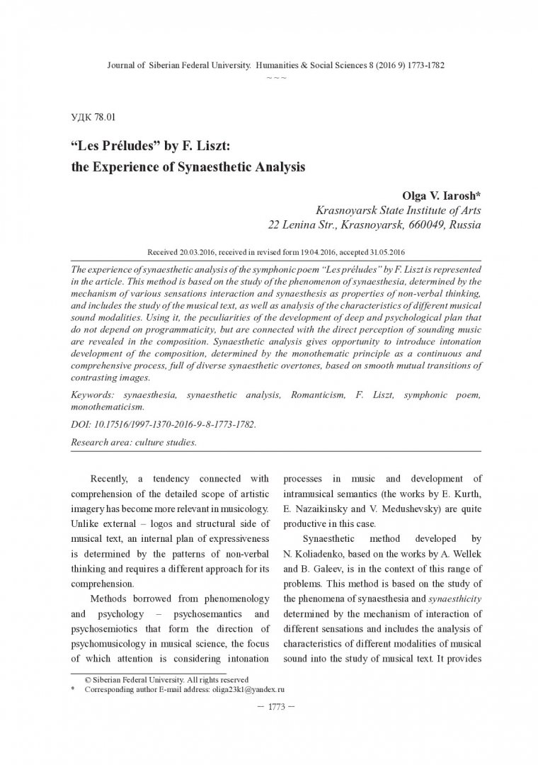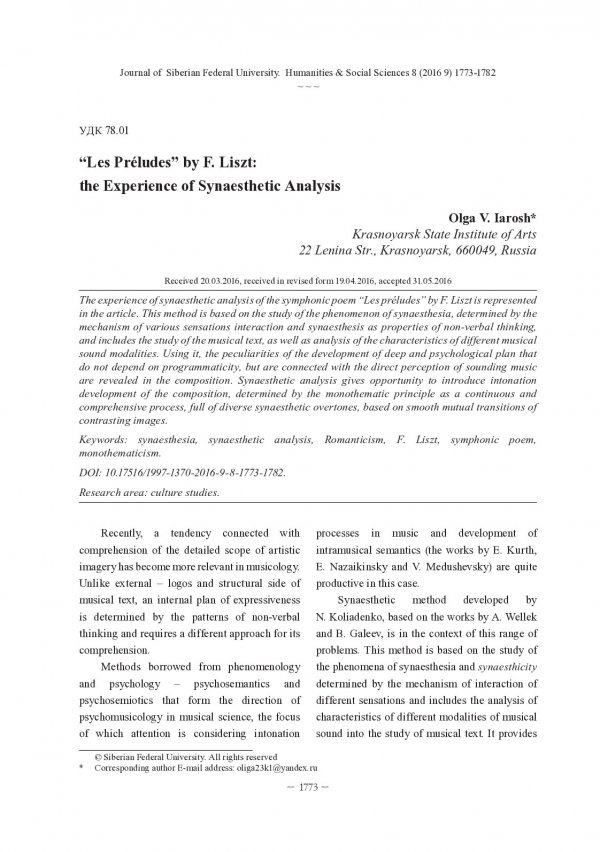 Библиографическое описание:Iarosh, Olga. "Les Preludes" by F. Liszt: the Experience of Synaesthetic Analysis = "Прелюды" Ф. Листа: опыт синестетического анализа / O. V. Iarosh. - Текст : непосредственный // Журнал Сибирского федерального университета. Гуманитарные науки. - 2016. - Т. 9, № 8. - С. 1773-1782. - Библиогр.: с. 1781-1782. - ISSN 1997-1370.