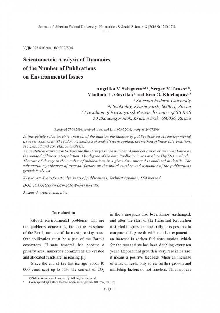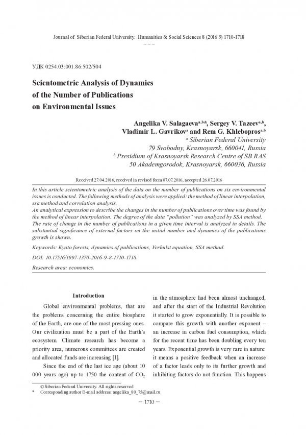 Библиографическое описание:Scientometric Analysis of Dynamics of the Number of Publications on Environmental Issues = Наукометрический анализ динамики числа публикаций по экологическим тематикам / A. V. Salagaeva [и др.]. - Текст : непосредственный // Журнал Сибирского федерального университета. Гуманитарные науки. - 2016. - Т. 9, № 8. - С. 1710-1718. - Библиогр.: с. 1717-1718. - ISSN 1997-1370.