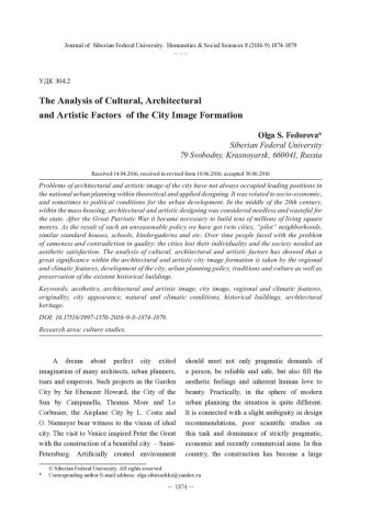 Библиографическое описание: Fedorova, Olga. The Analysis of Cultural, Architectural and Artistic Factors of the City Image Formation = Анализ культурологических и архитектурно-художественных факторов формирования образа города / O. S. Fedorova. - Текст : непосредственный // Журнал Сибирского федерального университета. Гуманитарные науки. - 2016. - Т. 9, № 8. - С. 1874-1879. - Библиогр.: с. 1878-1879. - ISSN 1997-1370.