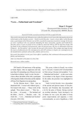 Библиографическое описание: Prygun, Elena. "Love… Fatherland and Freedom!" = "Любовь… Отечество и свобода!" / E. V. Prygun. - Текст : непосредственный // Журнал Сибирского федерального университета. Гуманитарные науки. - 2016. - Т. 9, № 8. - С. 1783-1789. - Библиогр.: с. 1788-1789. - ISSN 1997-1370.