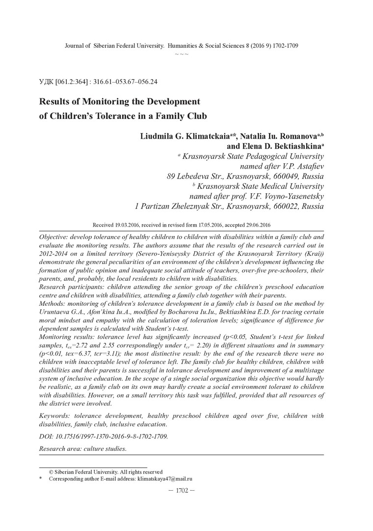 Библиографическое описание: Klimatckaia, Liudmila. Results of Monitoring the Development of Children’s Tolerance in a Family Club = Итоги мониторинга формирования толерантности у детей в условиях семейного клуба / L. G. Klimatckaia, N. Iu. Romanova, E. D. Bektiashkina. - Текст : непосредственный // Журнал Сибирского федерального университета. Гуманитарные науки. - 2016. - Т. 9, № 8. - С. 1702-1709. - Библиогр.: с. 1706-1709. - ISSN 1997-1370.