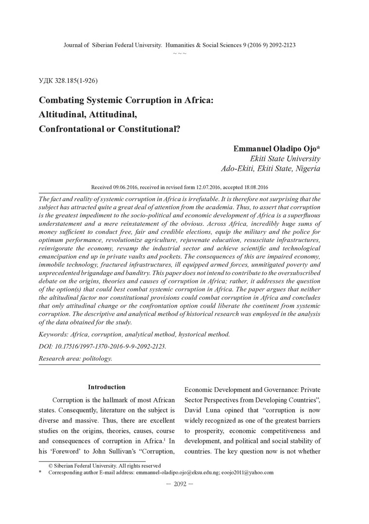 Библиографическое описание:Ojo, Emmanuel Oladipo. Combating Systemic Corruption in Africa: Altitudinal, Attitudinal, Confrontational or Constitutional? = Противодействие систематической коррупции в Африке: оценочное, конфронтационное или конституционное? / E. O. Ojo. - Текст : непосредственный // Журнал Сибирского федерального университета. Гуманитарные науки. - 2016. - Т. 9, № 9. - С. 2092-2113. - Библиогр.: с. 2110-2113. - ISSN 1997-1370.