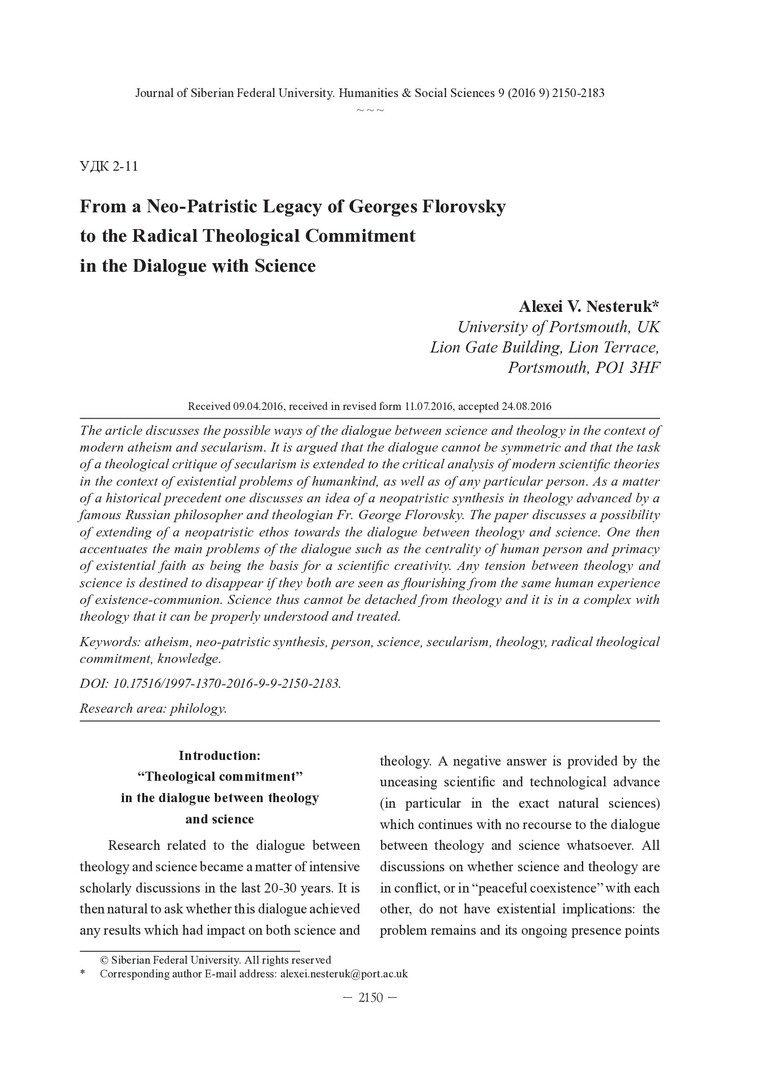 Библиографическое описание:Nesteruk, Alexei. From a Neo-Patristic Legacy of Georges Florovsky to the Radical Theological Commitment in the Dialogue with Science = От неопатристического наследия о. Георгия Флоровского к радикальной богословской установке в диалоге с наукой / A. V. Nesteruk. - Текст : непосредственный // Журнал Сибирского федерального университета. Гуманитарные науки. - 2016. - Т. 9, № 9. - С. 2150-2183. - Библиогр.: с. 2179-2183. - ISSN 1997-1370.