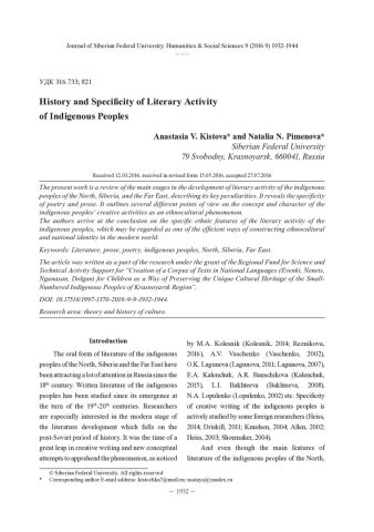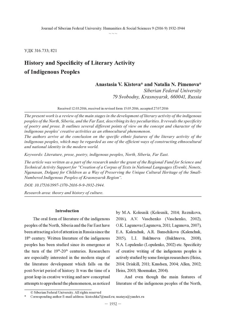 Библиографическое описание:Kistova, Anastasia. History and Specificity of Literary Activity of Indigenous Peoples = История и специфика литературного творчества коренных народов / A. V. Kistova, N. N. Pimenova. - Текст : непосредственный // Журнал Сибирского федерального университета. Гуманитарные науки. - 2016. - Т. 9, № 9. - С. 1932-1944. - Библиогр.: с. 1940-1944. - ISSN 1997-1370.