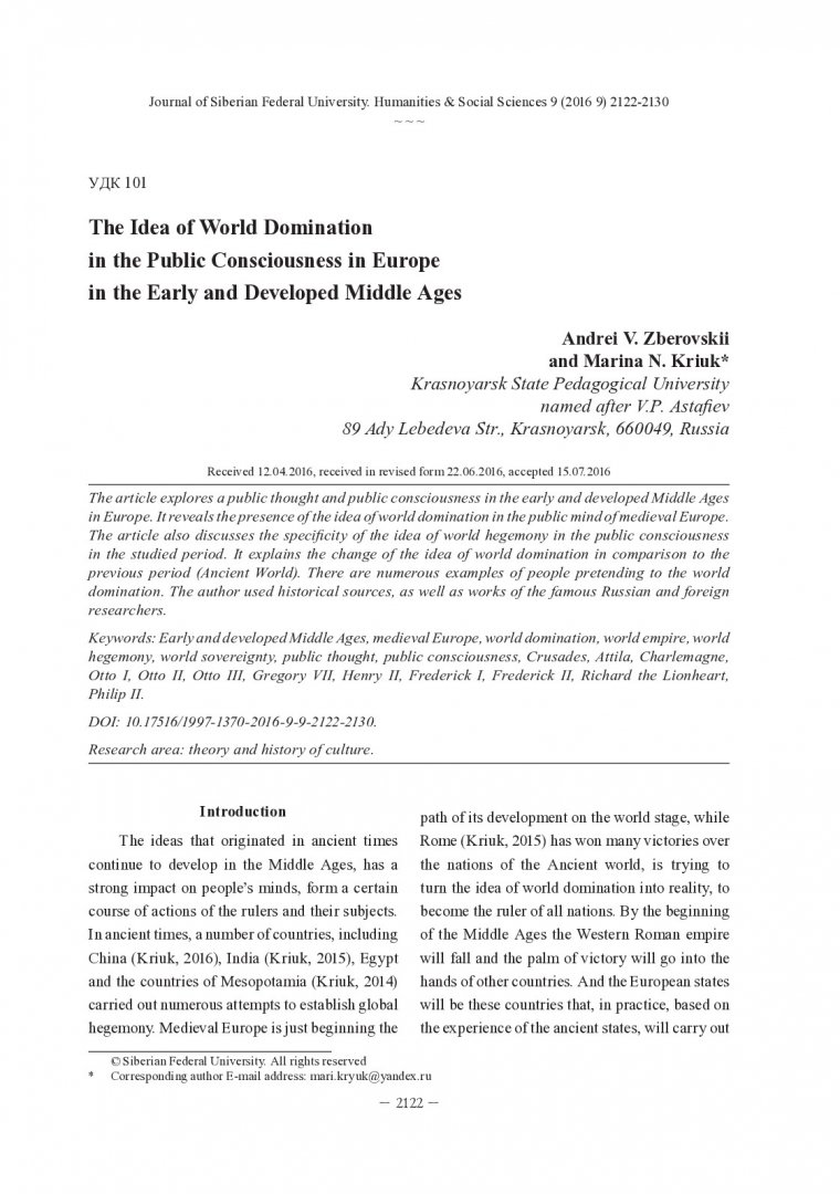 Библиографическое описание:Zberovskii, Andrei. The Idea of World Domination in the Public Consciousness in Europe in the Early and Developed Middle Ages = Идея мирового господства в общественном сознании Европы в раннем и развитом Средневековье / A. V. Zberovskii, M. N. Kriuk. - Текст : непосредственный // Журнал Сибирского федерального университета. Гуманитарные науки. - 2016. - Т. 9, № 9. - С. 2122-2130. - Библиогр.: с. 2128-2130. - ISSN 1997-1370.