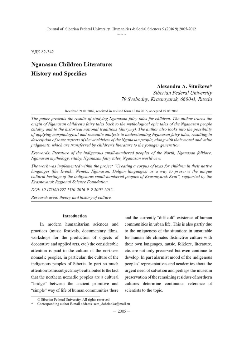 Библиографическое описание: Sitnikova, Alexandra. Nganasan Children Literature: History and Specifics = Нганасанская детская литература: история и специфика / A. A. Sitnikova. - Текст : непосредственный // Журнал Сибирского федерального университета. Гуманитарные науки. - 2016. - Т. 9, № 9. - С. 2005-2012. - Библиогр.: с. 2010-2012. - ISSN 1997-1370.