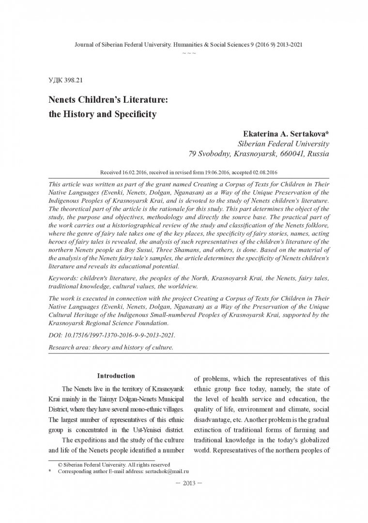 Библиографическое описание: Sertakova, Ekaterina. Nenets Children’s Literature: the History and Specificity = Ненецкая детская литература: история и специфика / E. A. Sertakova. - Текст : непосредственный // Журнал Сибирского федерального университета. Гуманитарные науки. - 2016. - Т. 9, № 9. - С. 2013-2021. - Библиогр.: с. 2018-2021. - ISSN 1997-1370.