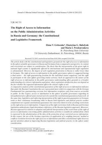 Библиографическое описание:Gritsenko, Elena. The Right of Access to Information on the Public Administration Activities in Russia and Germany: the Constitutional and Legislative Framework = Право на доступ к информации о деятельности публичной администрации в России и Германии: конституционные и законодательные пределы / E. V. Gritsenko, E. G. Babelyuk, M. I. Proskuryakova. - Текст : непосредственный // Журнал Сибирского федерального университета. Гуманитарные науки. - 2016. - Т. 9, № 9. - С. 2202-2222. - Библиогр.: с. 2219-2222. - ISSN 1997-1370.