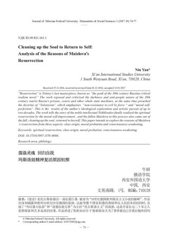 Библиографическое описание:Niu Yan. Cleaning up the Soul to Return to Self: Analysis of the Reasons of Maislova`s Resurrection / Niu Yan = Причины духовного воскресения Екатерины Масловой: очищение души и возвращение к себе. - Текст : непосредственный // Журнал Сибирского федерального университета. Гуманитарные науки. - 2017. - Т. 10, № 1. -С. 74-77. - Библиогр.: с. 77. - ISSN 1997-1370.