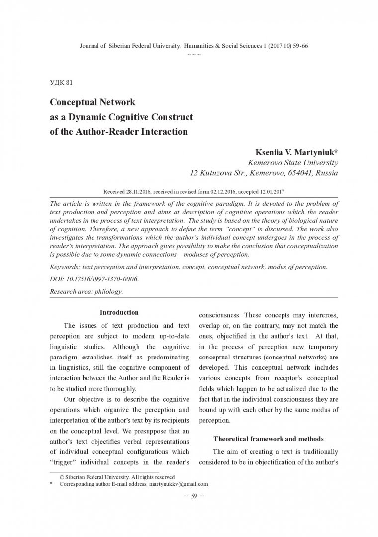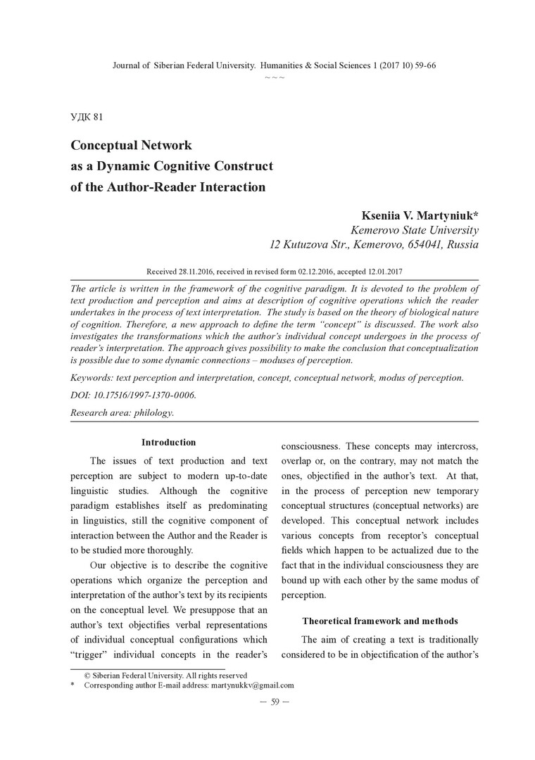 Библиографическое описание:Martyniuk, Kseniia. Conceptual Network as a Dynamic Cognitive Construct of the Author-Reader Interaction / K. V. Martyniuk = Концептуальная сеть как динамический когнитивный конструкт взаимодействия автора и читателя. - Текст : непосредственный // Журнал Сибирского федерального университета. Гуманитарные науки. - 2017. - Т. 10, № 1. -С. 59-66. - Библиогр.: с. 65-66. - ISSN 1997-1370.