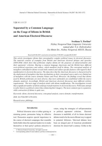 Библиографическое описание:Pavlina, Svetlana. Separated by a Common Language: on the Usage of Idioms in British and American Electoral Discourse = Разделенные общим языком: использование идиом в британском и американском политических дискурсах / S. Y. Pavlina. - Текст : непосредственный // Журнал Сибирского федерального университета. Гуманитарные науки. - 2017. - Т. 10, № 10. - С. 1563-1572. - Библиогр.: с. 1570-1572. - ISSN 1997-1370.