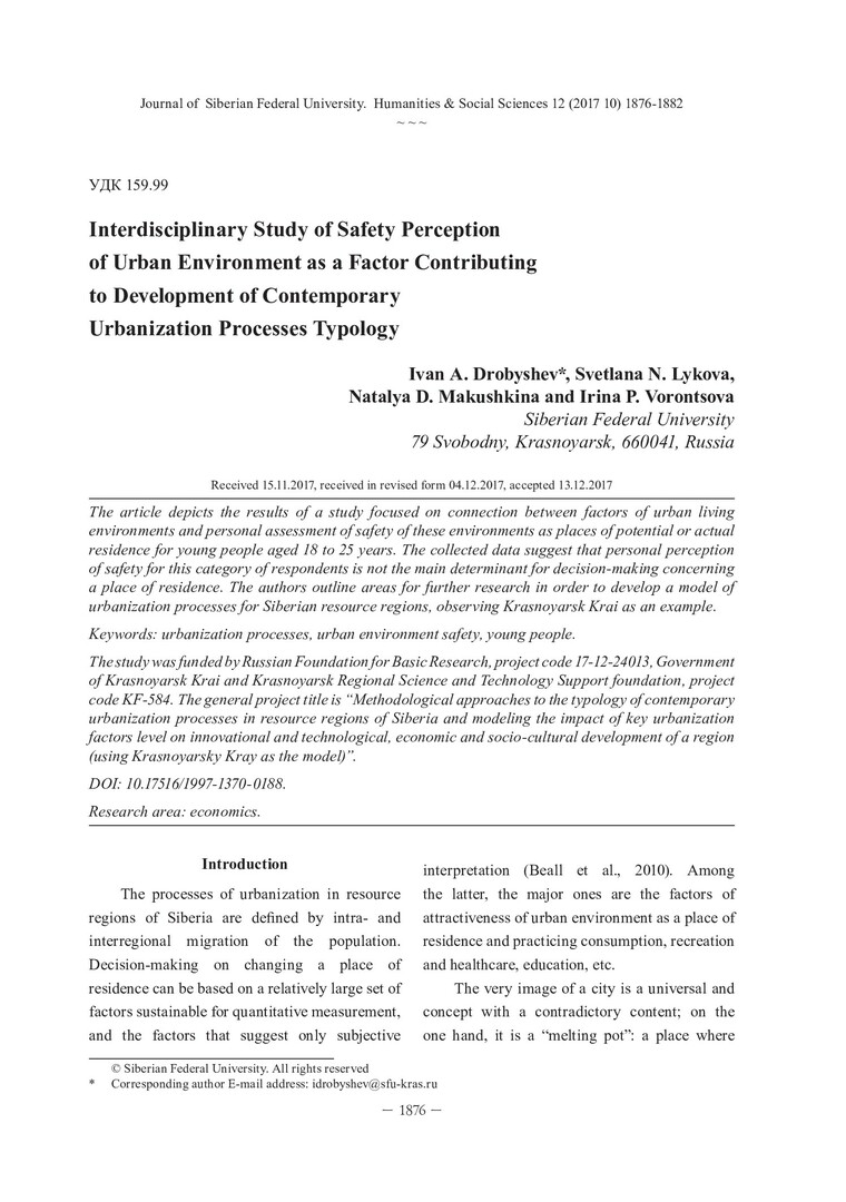 Библиографическое описание:Interdisciplinary Study of Safety Perception of Urban Environment as a Factor Contributing to Development of Contemporary Urbanization Processes Typology = Междисциплинарное исследование восприятия безопасности городской среды как фактора типологизации процессов урбанизации / I. A. Drobyshev [et al.]. - Текст : непосредственный // Журнал Сибирского федерального университета. Гуманитарные науки. - 2017. - Т. 10, № 12. - С. 1876-1882. - Библиогр.: с. 1880-1882. - ISSN 1997-1370.