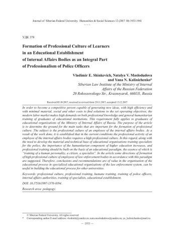 Библиографическое описание:Shinkevich, Vladimir. Formation of Professional Culture of Learners in an Educational Establishment of Internal Affairs Bodies as an Integral Part of Professionalism of Police Officers = Формирование профессиональной культуры обучающихся в условиях образовательной организации органов внутренних дел как неотъемлемой составляющей профессионализма сотрудников полиции / V. E. Shinkevich, N. V. Maslodudova, Ya. N. Kalinichenko. - Текст : непосредственный // Журнал Сибирского федерального университета. Гуманитарные науки. - 2017. - Т. 10, № 12. - С. 1933-1941. - Библиогр.: с. 1939-1941. - ISSN 1997-1370.