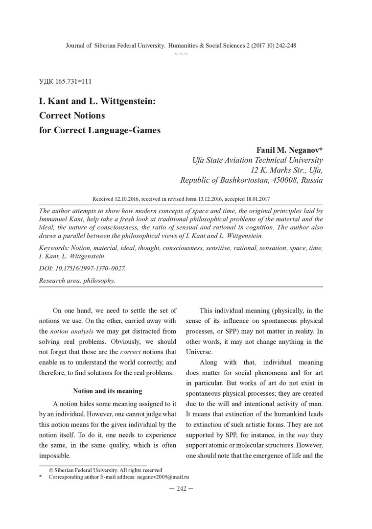 Библиографическое описание:Neganov, Fanil. I. Kant and L. Wittgenstein: Correct Notions for Correct Language-Games / F. M. Neganov = И.Кант и Л.Витгенштейн: правильные понятия для правильных языковых игр. - Текст : непосредственный // Журнал Сибирского федерального университета. Гуманитарные науки. - 2017. - Т. 10, № 2. -С. 242-248. - ISSN 1997-1370.