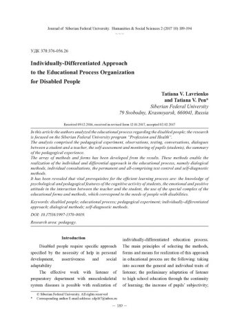 Библиографическое описание:Lavrienko, Tatiana. Individually-Differentiated Approach to the Educational Process Organization for Disabled People / T. V. Lavrienko, = Индивидуально-дифференцированный подход при организации образовательного процесса для лиц с ограниченными возможностями здоровья. - Текст : непосредственный // Журнал Сибирского федерального университета. Гуманитарные науки. - 2017. - Т. 10, № 2. -С. 189-194. - Библиогр.: с. 193-194. - ISSN 1997-1370.