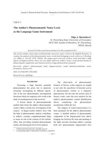 Библиографическое описание:Bartashova, Olga. The Author`s Phonosemantic Nonce Lexis as the Language Game Instrument = Авторская окказиональная звукоизобразительная лексика как средство языковой игры / O. A. Bartashova. - Текст : непосредственный // Журнал Сибирского федерального университета. Гуманитарные науки. - 2017. - Т. 10, № 3. - С. 303-316. - Библиогр.: с. 314-316. - ISSN 1997-1370.