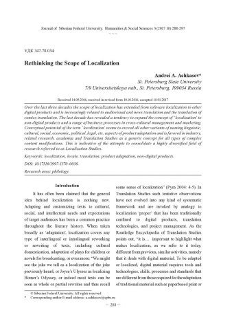 Библиографическое описание:Achkasov, Andrei. Rethinking the Scope of Localization = Переосмысляя практику локализации / A. A. Achkasov. - Текст : непосредственный // Журнал Сибирского федерального университета. Гуманитарные науки. - 2017. - Т. 10, № 3. - С. 288-297. - Библиогр.: с. 295-297. - ISSN 1997-1370.