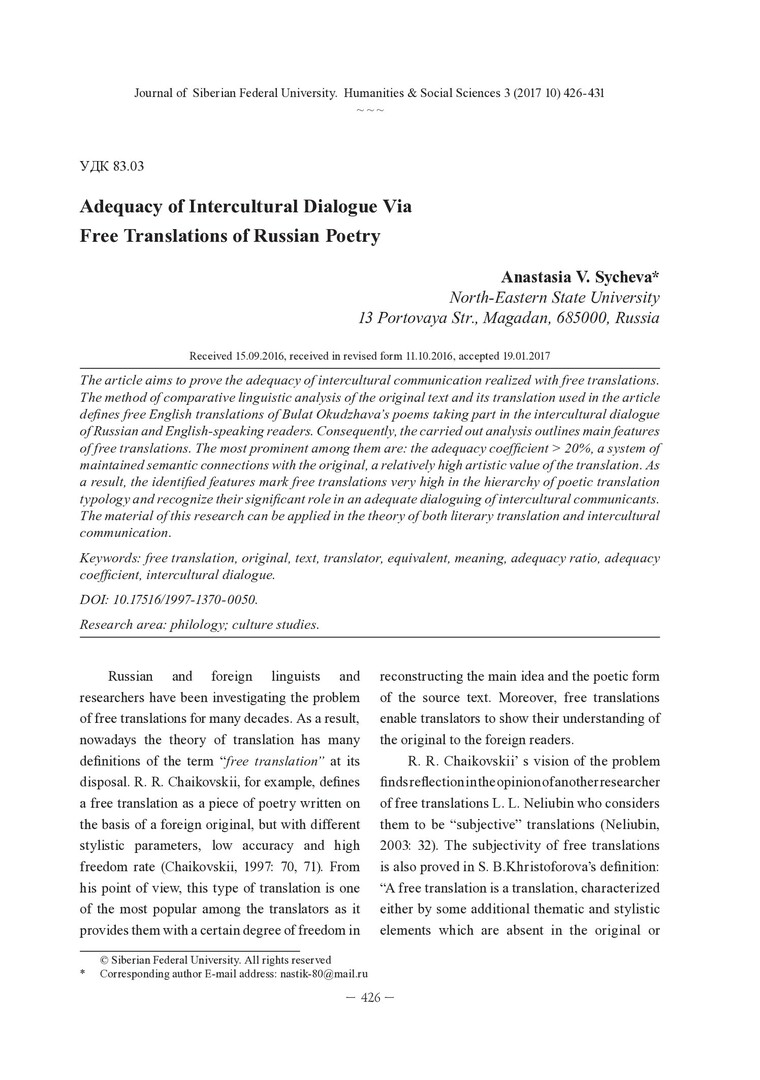 Библиографическое описание:Sycheva, Anastasia. Adequacy of Intercultural Dialogue Via Free Translations of Russian Poetry = К вопросу об адекватности межкультурного диалога посредством вольных переводов русской поэзии / A. V. Sycheva. - Текст : непосредственный // Журнал Сибирского федерального университета. Гуманитарные науки. - 2017. - Т. 10, № 3. - С. 426-431. - Библиогр.: с. 430-431. - ISSN 1997-1370.