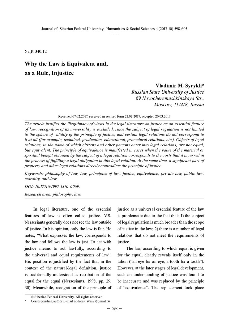 Библиографическое описание:Syrykh, Vladimir. Why the Law is Equivalent and, as a Rule, Injustice = Почему право является эквивалентным и, как правило, несправедливым / V. M. Syrykh. - Текст : непосредственный // Журнал Сибирского федерального университета. Гуманитарные науки. - 2017. - Т. 10, № 4. - С. 598-605. - Библиогр.: с. 605. - ISSN 1997-1370.