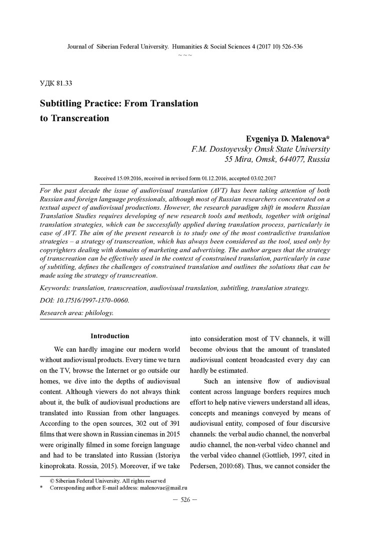 Библиографическое описание:Malenova, Evgeniya. Subtitling Practice: From Translation to Transcreation = Проблемы перевода субтитров: от перевода к транскреации / E. D. Malenova. - Текст : непосредственный // Журнал Сибирского федерального университета. Гуманитарные науки. - 2017. - Т. 10, № 4. - С. 526-536. - Библиогр.: с. 534-536. - ISSN 1997-1370.