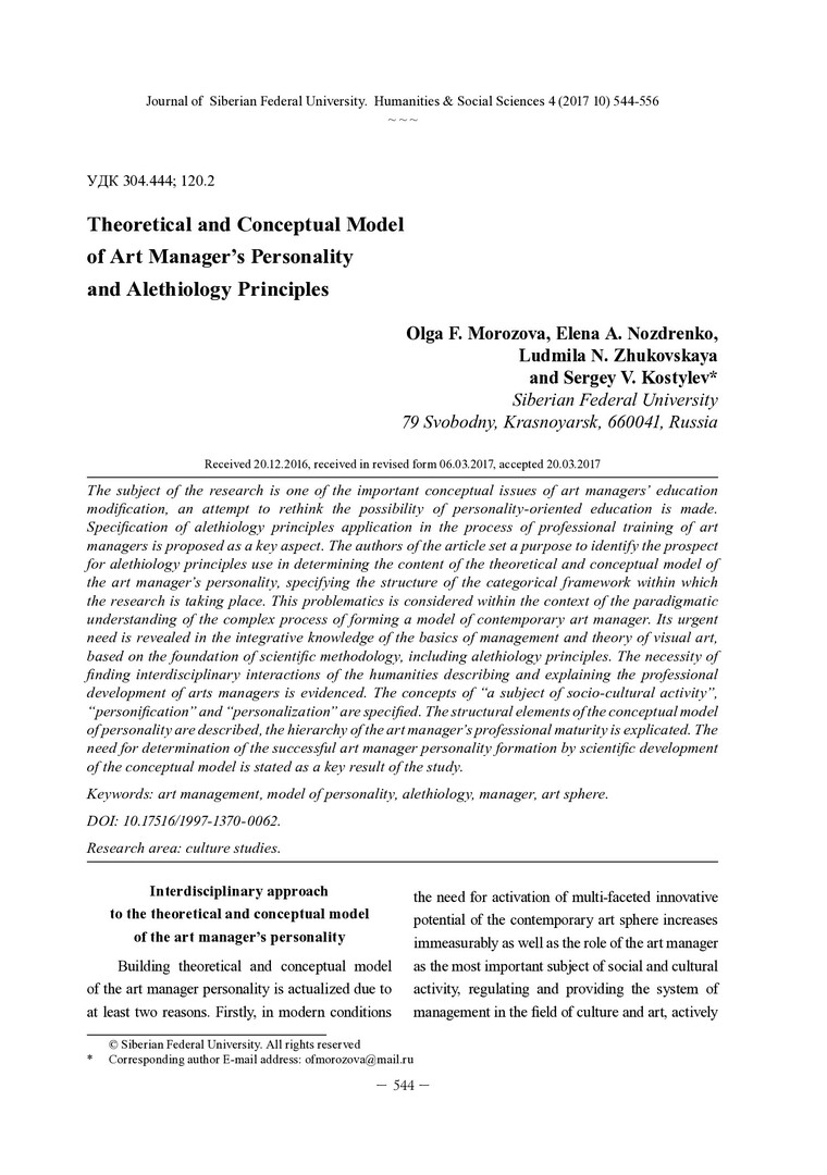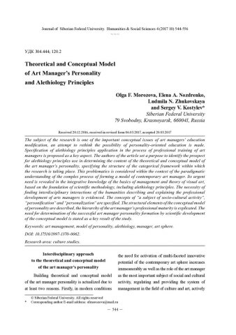 Библиографическое описание:Theoretical and Conceptual Model of Art Manager`s Personality and Alethiology Principles = Теоретико-смысловая модель личности арт-менеджера и принципы алетологии / О. Ф. Морозова [и др.]. - Текст : непосредственный // Журнал Сибирского федерального университета. Гуманитарные науки. - 2017. - Т. 10, № 4. - С. 544-556. - Библиогр.: с. 554-556. - ISSN 1997-1370.