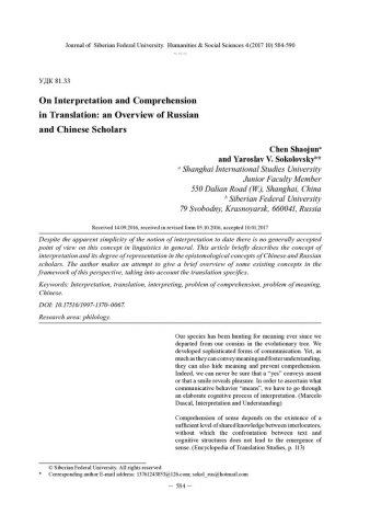 Библиографическое описание:Chen Shaojuna. On Interpretation and Comprehension in Translation: an Overview of Russian and Chinese Scholars = К вопросу об интерпретации и понимании в переводе: обзор взглядов российских и китайских исследователей / Chen Shaojuna, Ya. V. Sokolovsky. - Текст : непосредственный // Журнал Сибирского федерального университета. Гуманитарные науки. - 2017. - Т. 10, № 4. - С. 584-590. - Библиогр.: с. 589-590. - ISSN 1997-1370.