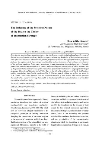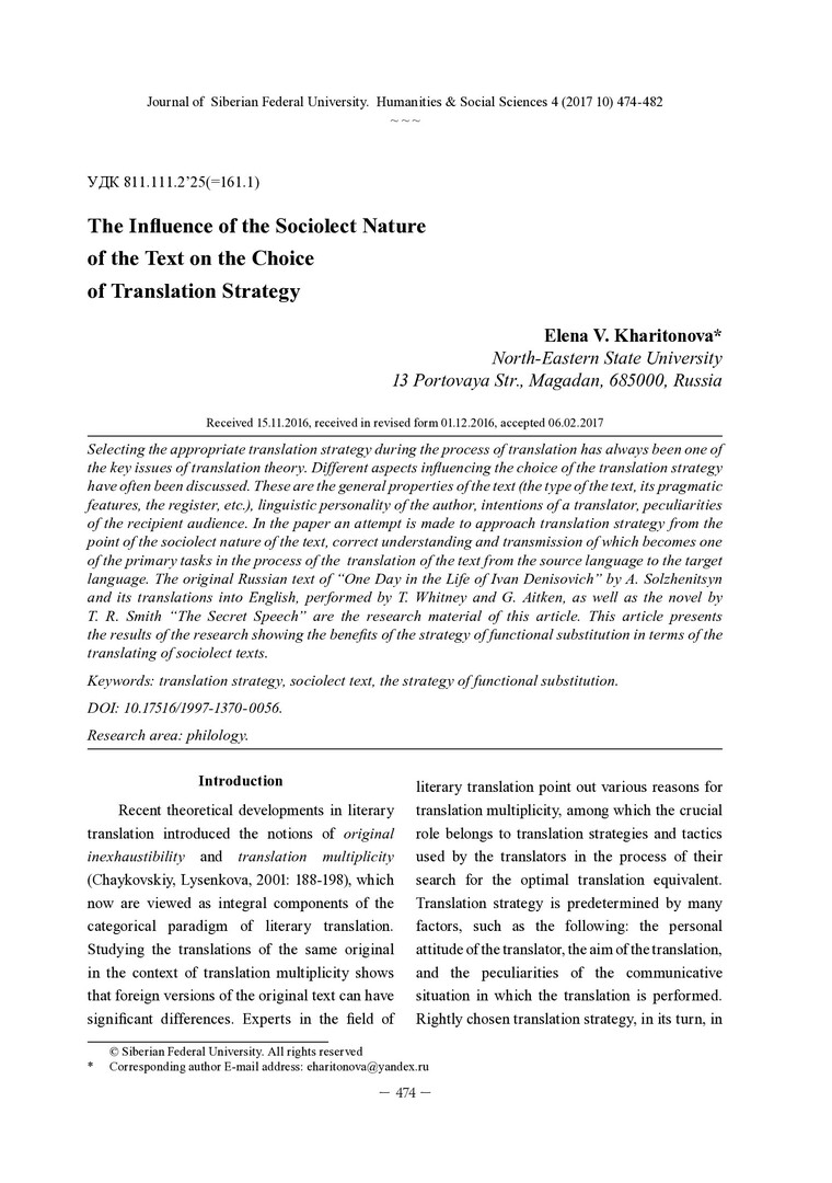 Библиографическое описание:Kharitonova, Elena. The Influence of the Sociolect Nature of the Text on the Choice of Translation Strategy = Влияние социолектной природы текста на выбор переводческой стратегии / E. V. Kharitonova. - Текст : непосредственный // Журнал Сибирского федерального университета. Гуманитарные науки. - 2017. - Т. 10, № 4. - С. 474-482. - Библиогр.: с. 480-482. - ISSN 1997-1370.
