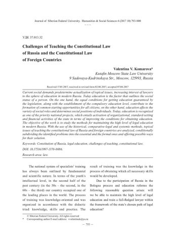 Библиографическое описание:Komarova, Valentina. Challenges of Teaching the Constitutional Law of Russia and the Constitutional Law of Foreign Countries = Проблемы преподавания конституционного права России и конституционного права зарубежных стран / V. V. Komarova. - Текст : непосредственный // Журнал Сибирского федерального университета. Гуманитарные науки. - 2017. - Т. 10, № 6. - С. 793-800. - Библиогр.: с. 799-800. - ISSN 1997-1370.