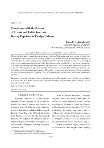 Библиографическое описание:Andreychenko, Elena. Compliance with the Balance of Private and Public Interests During Expulsion of Foreign Citizens = Соблюдение баланса частных и публичных интересов при высылке иностранных граждан / E. E. Andreychenko. - Текст : непосредственный // Журнал Сибирского федерального университета. Гуманитарные науки. - 2017. - Т. 10, № 6. - С. 938-946. - Библиогр.: с. 944-946. - ISSN 1997-1370.