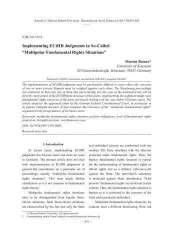 Библиографическое описание:Breuer, Marten. Implementing ECtHR Judgments in So-Called "Multipolar Fundamental Rights Situations" = Внедрение решений Европейского суда по правам человека в так называемых ситуациях многополярных фундаментальных прав / Breuer, Marten. - Текст : непосредственный // Журнал Сибирского федерального университета. Гуманитарные науки. - 2017. - Т. 10, № 6. - С. 851-858. - Библиогр.: с. 856-858. - ISSN 1997-1370.