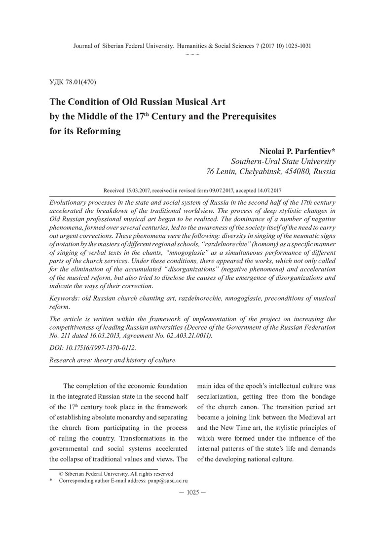 Библиографическое описание:Parfentiev, Nicolai. The Condition of Old Russian Musical Art by the Middle of the 17th Century and the Prerequisites for its Reforming = Состояние древнерусского музыкального искусства к середине XVII в. и назревание его реформы / N. P. Parfentiev. - Текст : непосредственный // Журнал Сибирского федерального университета. Гуманитарные науки. - 2017. - Т. 10, № 7. - С. 1025-1031. - Библиогр.: с. 1030-1031. - ISSN 1997-1370.