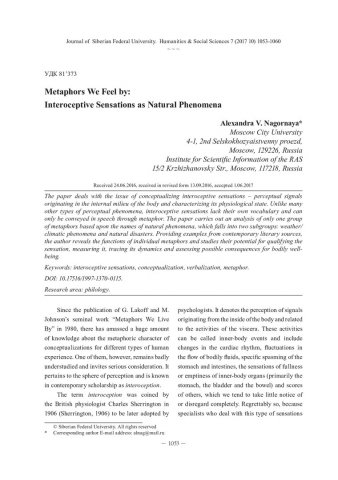 Библиографическое описание:Nagornaya, Alexandra. Metaphors We Feel by: Interoceptive Sensations as Natural Phenomena = Метафоры, которыми мы чувствуем: интероцептивные ощущения как явления природы / A. V. Nagornaya. - Текст : непосредственный // Журнал Сибирского федерального университета. Гуманитарные науки. - 2017. - Т. 10, № 7. - С. 1053-1060. - Библиогр.: с. 1059-1060. - ISSN 1997-1370.