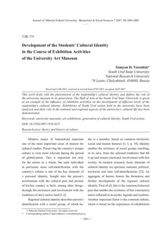 Библиографическое описание:Voroshin, Semyon. Development of the Students` Cultural Identity in the Course of Exhibition Activities of the University Art Museum = Конструирование культурной идентичности студенчества в процессе выставочной деятельности университетского художественного музея / S. D. Voroshin. - Текст : непосредственный // Журнал Сибирского федерального университета. Гуманитарные науки. - 2017. - Т. 10, № 7. - С. 1083-1089. - Библиогр.: с. 1087-1089. - ISSN 1997-1370.
