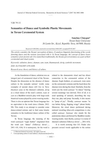 Библиографическое описание:Sanchay, Choygan. Semantics of dance and symbolic plastic movements in tuvan ceremonial system = Семантика танца и символическая пластика в обрядовой системе тувинцев / Choygan Sanchay. - Текст : непосредственный // Журнал Сибирского федерального университета. Гуманитарные науки. - 2017. - Т. 10, № 7. - С. 1002-1006. - Библиогр.: с. 1005-1006. - ISSN 1997-1370.